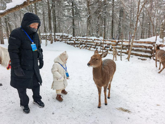行至景區(qū)中心處的“粉雪部落”,濃郁的東北風(fēng)情撲面而來。“智取威虎山”主題場景成了最熱鬧的打卡點,歡聲笑語不斷。鹿園里,孩子們輕輕撫摸馴鹿、喂食苔蘚,體驗著與森林精靈親近的樂趣!霸谀戏綇臎]見過真正的馴鹿,這種體驗太難得了”,來自云南的段先生一邊錄制視頻,一邊準備向家人“炫耀”這份難得的美好。