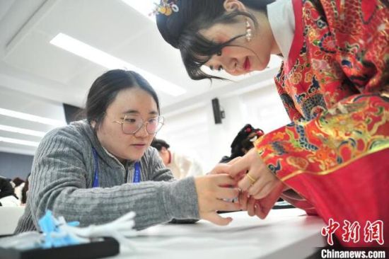 1月23日,巫珮瑄(左)在吉林長(zhǎng)春學(xué)習(xí)制作漢服手工仿絨花雪花胸針。