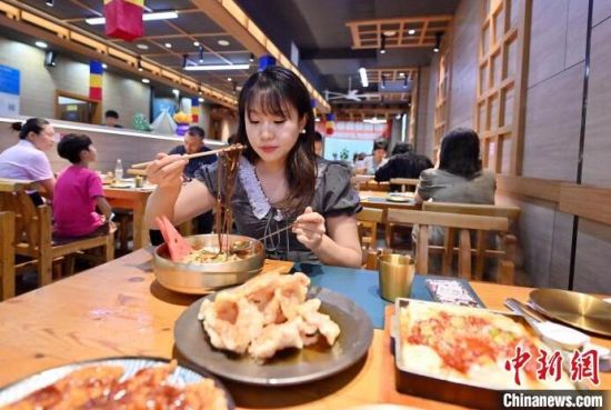 7月23日,吉林長春,食客體驗延吉冷面配鍋包肉的“冷熱配”吃法。 中新社記者 張瑤 攝