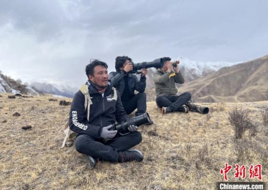 資料圖為3月22日,達杰(左一)與其他牧民攝影師一同拍攝野生動物。 中新社記者 李江寧 攝