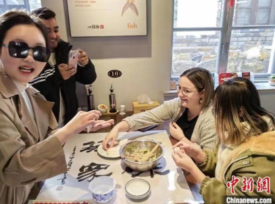 圖為外國留學生在山東煙臺學習包鲅魚水餃!≈行律缬浾 李長亮 攝