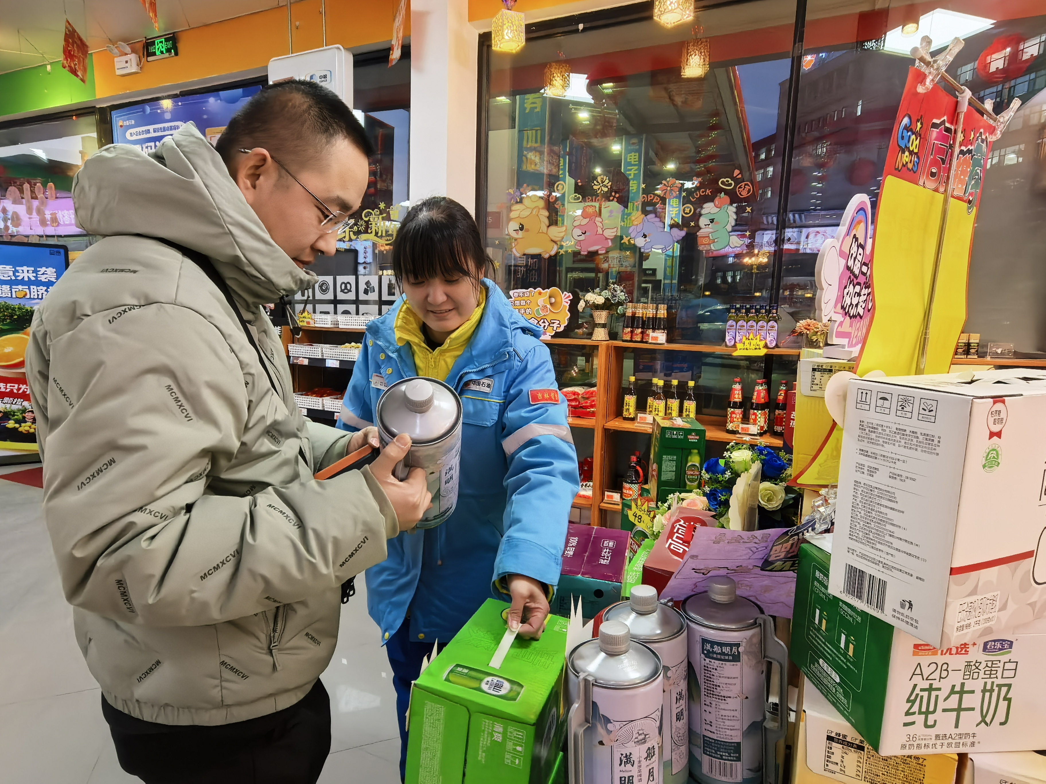長(zhǎng)春分公司普慶站員工為顧客推薦年貨好物。中國(guó)石油吉林銷售公司/供圖