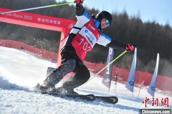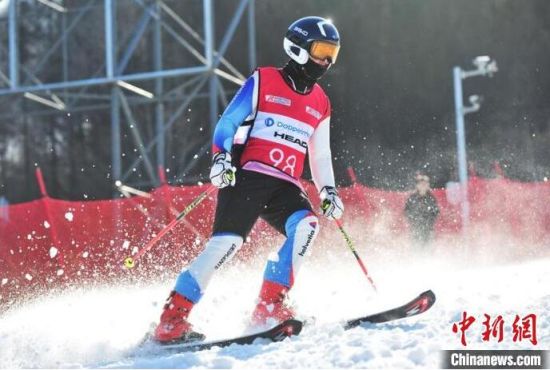 中國(guó)高山滑雪選手沖過終點(diǎn)。