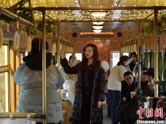 1月8日,吉林長春,一輛54路有軌電車文旅專列吸引游客打卡拍照。該專列外形復(fù)古,車廂布置獨(dú)具特色,游客預(yù)約后可購票乘車體驗(yàn)車內(nèi)及市區(qū)沿線的人文風(fēng)情。