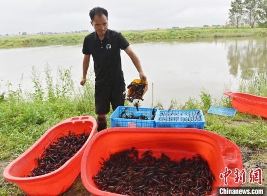 8月22日,在吉林省伊通縣三聯(lián)水庫灌區(qū)的小龍蝦苗培育基地,工作人員在展示小龍蝦。該基地科研團(tuán)隊(duì)在成功培育出了適應(yīng)北方寒地環(huán)境小龍蝦苗的同時(shí),還創(chuàng)新探索出稻田養(yǎng)殖蝦蟹新模式,通過生態(tài)良性循環(huán)提升稻米品質(zhì),也能更好地保護(hù)和利用黑土地。中新社記者 張瑤 攝