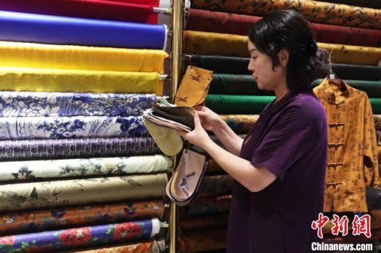 8月5日,吉林市旗袍館,朱文俊在為客戶(hù)挑選布料。 中新社記者 蒼雁 攝
