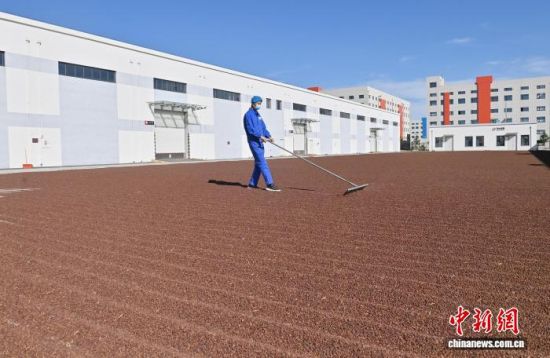 吉林梅河口一家松子加工企業(yè),工人在晾曬松子。(資料圖)張瑤 攝